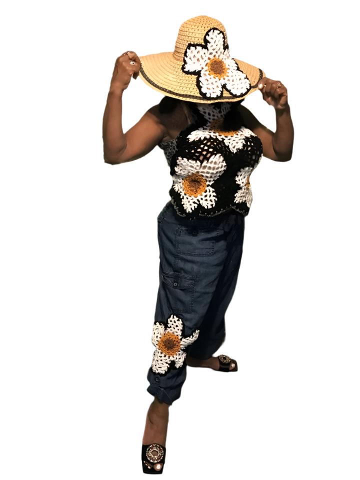 Buy yourself flowers! Stun them with your look, flair and fun. Hand crocheted, 100% acrylic yarn . The black and white contracts colors are popping and a sprinkle of medallion yellow surrounded by dandelion yellow accents in just the right spot. Little bit of this and a little bit of that equals DIVA status and that's that! Have some fun with this outfit and accessories. Express your personality and style, These items are sold separately, Look for them on this site.